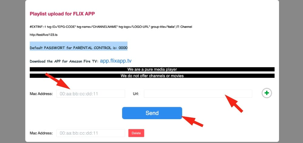 - Inserisci le informazioni richieste, l’indirizzo MAC e il link M3U (IPTV-APK) e clicca su “Invia canale con contenuto”.